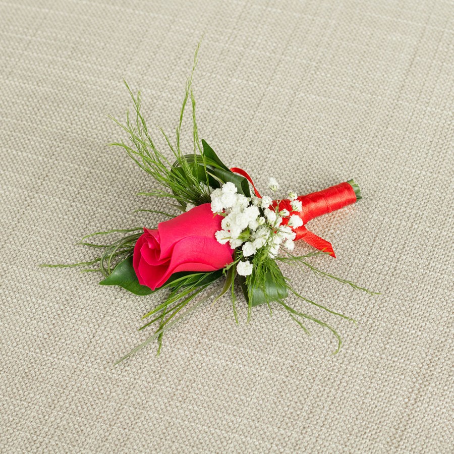 Introduce timeless elegance to your wedding with our red rose buttonholes. Each buttonhole features radiant red roses, delicate gypsophila, and verdant aralia leaves, gracefully tied with a satin red ribbon.