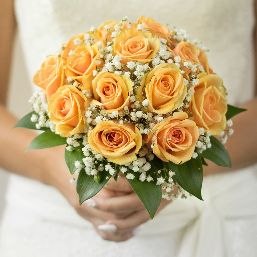 Enhance your wedding elegance with the Sound of Love Bridal Bouquet, a stunning blend of orange roses and exquisite gypsophila. This bouquet is carefully hand-selected to ensure each flower is exceptionally fresh and of the highest quality, offering a unique and beautiful focal point for your special day.